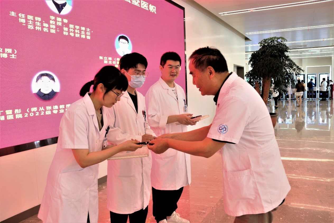 独墅湖医院成立虽然仅有20个月,却有着深厚的师生传承。侯建全教授、杨建平教授、张学军教授、李德春教授都已经有了第三代研究生弟子,在教师节、中秋节双节前夕这一有纪念意义的日子里,师生共聚一堂举行这一活动,既表达了对师道的尊重,也寄托了师长们对新一代研究生的殷切期望。独墅湖医院的各位老师担负为党育人、为国育才使命,牢记习近平总书记嘱托,以高度的责任感和使命感,在教书育人的伟大事业中实现人生价值、绽放绚丽光彩。