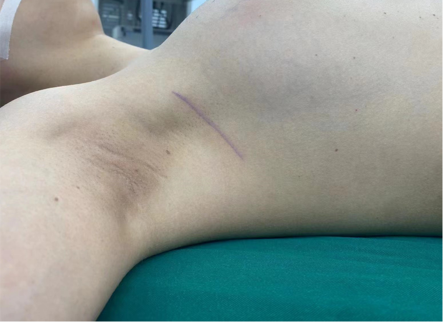 张主任另辟蹊径,决定对她实施经外侧腋窝切口的腔镜辅助下的乳房肿块切除术,以最大程度缩小创口,这样既避免了巨大手术切口的丑陋,又实现了乳房大肿瘤的完整切除。