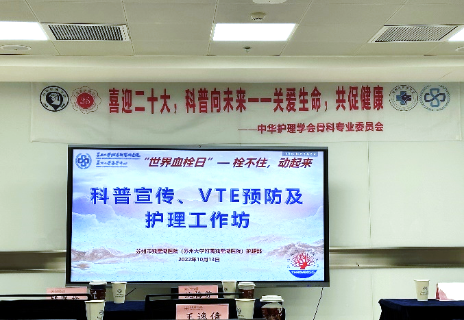 2014年3月,国际血栓与止血学会(ISTH)宣布将鲁道夫·菲尔绍的生日(10月13日)作为“世界血栓日”,以纪念他首先提出“血栓形成理论”。临床上,血栓栓塞性疾病常见、多发,危害大,被称为“沉寂的杀手”。为了进一步弘扬以全民健康为中心的理念,倡导科学健康的生活方式,强化护理人员风险防范意识,提高护理人员VTE 防控专业知识和规范预防率,2022年 10月13日,苏州大学附属独墅湖医院护理部成功举办“世界血栓日”主题活动——VTE 物理预防实践。本次活动由中华护理学会骨科护理专业委员会副主任委员、苏州大学附属独墅湖医院护理部王洁主任主持并进行倡导发言,点明血栓日活动主题“栓不住,动起来”的由来和意义,强调了VTE物理预防在临床护理实践工作中的重要性。