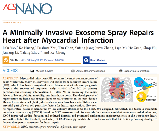 此次入选榜单的研究论文主要涉及外泌体与心肌损伤修复方面。我们通过设计、制造和测试了一种基于间充质干细胞外泌体和生物材料的微创外泌体喷雾剂(EXOS),使得小鼠在急性心肌梗死模型中改善了其心脏功能并减少了纤维化,同时促进了损伤后心脏的内源性血管肌生成。此外,我们进一步测试了EXOS在猪模型中的可行性和安全性,结果表明,使用EXOS是一种有前景的策略,可以为心脏修复提供治疗性外泌体,提示了生物材料用于心肌损伤修复的安全性及有效性,为心肌损伤修复提供了新的方向。