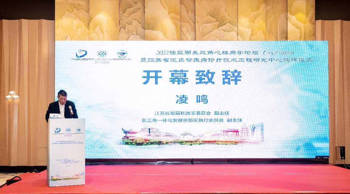 最后,江苏省发展和改革委员会副主任、长三角一体化发展示范区执行委员会副主任凌鸣致辞,凌主任对我院心内科在建院后短时间内取得了一大批科研成果及获得较高的国内知名度表示了肯定。同时,凌主任也对我院的学科建设及工程研究中心的发展提出了一定的期望,希望我院能够通过泛血管疾病工程研究中心这个平台,把医院的学术优势,结合园区生物医药产业集群,围绕新兴诊疗器械、创新药物、创新疗法及体外诊断试剂等方向,能够产出一批有重大产业化价值的成果,同时打造一支高效率、国际化的创新人才队伍;希望泛血管疾病工程研究中心以国家和全省战略需求为导向,聚焦解决“卡脖子”技术难题,将平台打造成为提升产业创新效率、推动创新链产业链深度融合的战略科技力量。