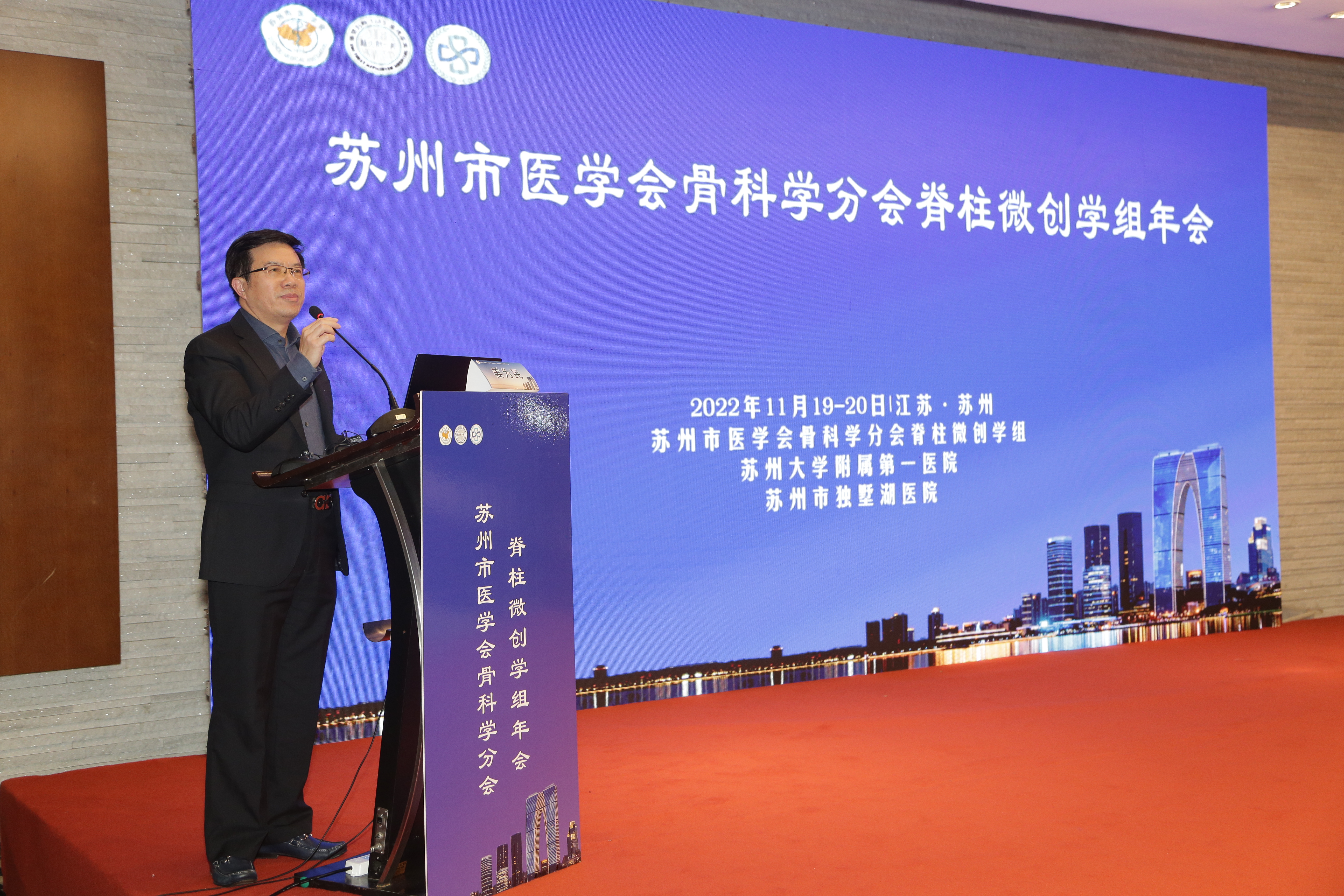 独墅湖医院党委书记、院长侯建全,苏州市医学会秘书长谭秋生,苏州市医学会骨科分会主任委员、苏州大学附属第一医院骨科主任杨惠林分别致辞。