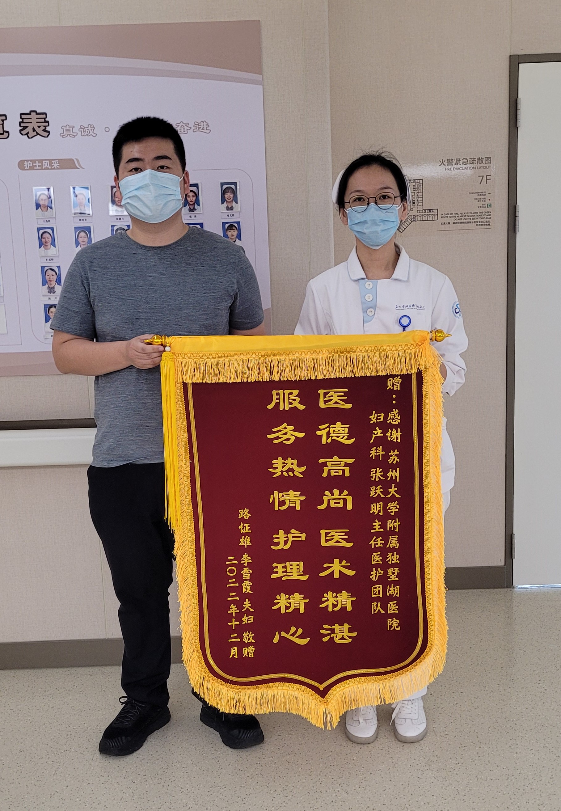 患者路先生、李女士赠送锦旗感谢我院妇产科张跃明主任团队
