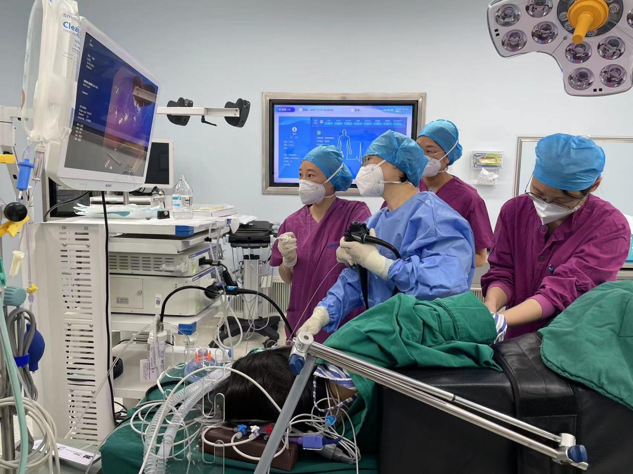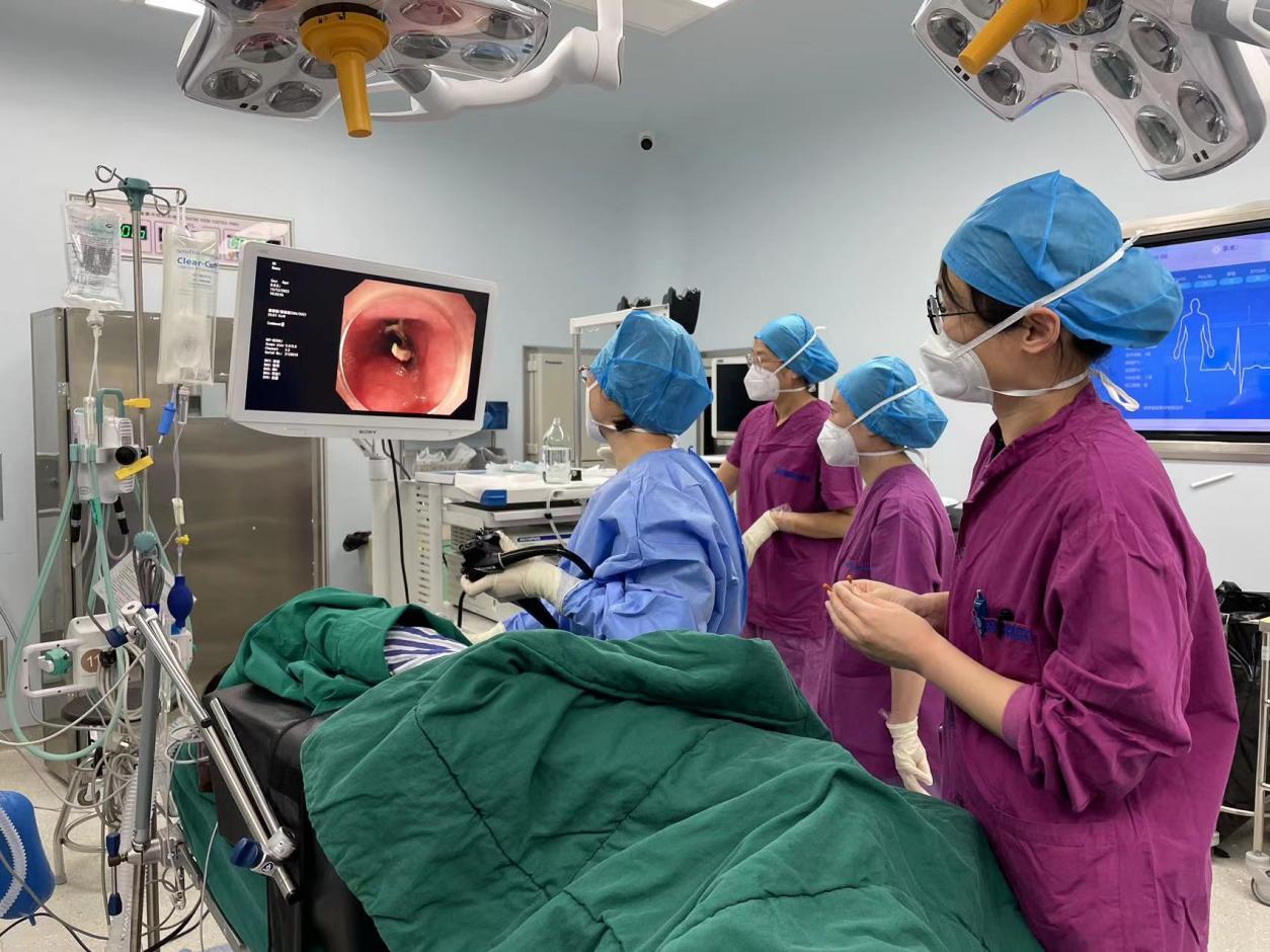 经过会诊后,蒋彩凤主任决定亲自给患者做胃镜。手术准备妥当,术中见到患者食管距门齿25cm有一白色不规则骨头样异物嵌顿,骑跨在食管中央,经过仔细观察,一端嵌入比较深,助手赵雪晴护士迅速置入异物钳夹住了异物中央,蒋彩凤主任通过内镜手法最终成功把骨头取出体外。重新进入胃镜见原来鸭骨头嵌顿的地方有一小破口,局部黏膜损伤明显,但出血较少,没有脓液或气泡从破口处冒出来。考虑术后有纵膈感染、迟发出血等风险,患者病情较重,收住中心ICU监护治疗。