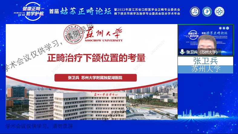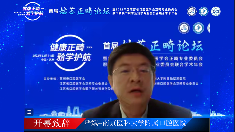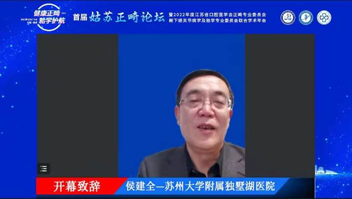 苏州大学附属独墅湖医院党委书记、院长侯建全致辞,对“首届姑苏论坛”的顺利开展表示祝贺,同时,对江苏省口腔医学会颞下颌关节病学及𬌗学专业委员会主任委员、苏州市口腔医学会正畸专业委员会主任委员张卫兵教授为提高苏州市口腔正畸及颞下颌关节病学临床诊疗水平做出的工作表示感谢,并预祝参会人员学有所得、学有所获。