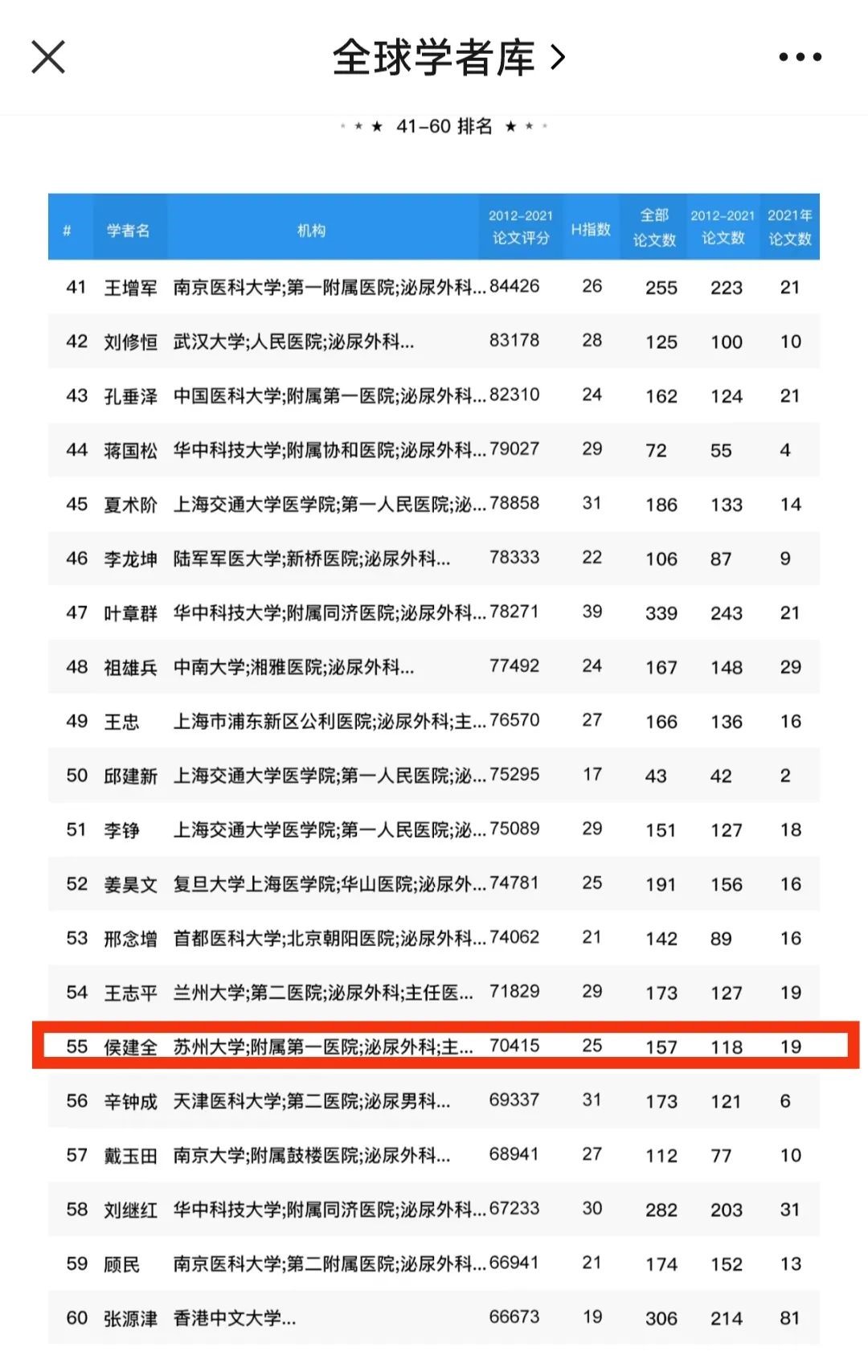 泌尿外科近10年(2012-2021)论文学术影响力排名出炉,我院侯建全书记以70415分的总积分名列第55位。