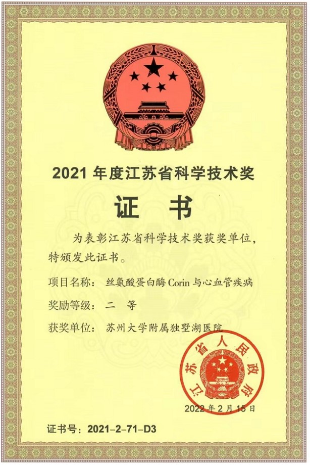 6月9日,江苏省省委、省政府举行的全省科学技术奖励大会在南京举行,大会颁发了2021年度各项科技奖项。苏州大学附属独墅湖医院副院长周亚峰教授参与的项目“丝氨酸蛋白酶corin与心血管疾病”获江苏省科学技术二等奖”。该奖项也是我院获得的第一个省部级科学技术奖,也是周亚峰教授自2015年获得江苏省科技进步一等奖(生物起搏应用于缓慢性心律失常治疗的相关研究)以来的第二个江苏省科技进步奖。