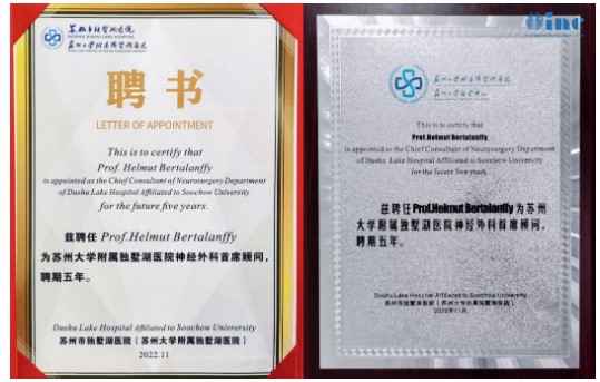 11月21日,INC旗下世界神经外科顾问团成员教授、世界颅底脑干肿瘤手术大师Helmut Bertalanffy(巴特朗菲)教授抵达苏州市独墅湖医院(苏州大学附属独墅湖医院),正式开启成人疑难脑瘤示范手术。苏州市独墅湖医院是INC国际教授来华进行成人疑难脑瘤手术的合作示范基地之一。INC巴特朗菲教授受聘成为我院神经外科首席顾问。