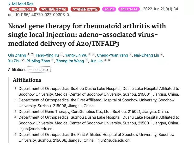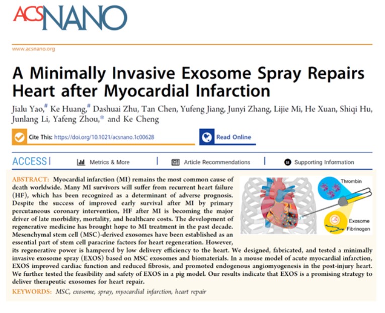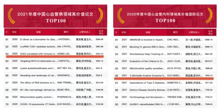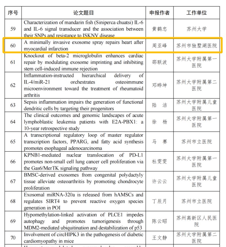 《2021年度中国心血管领域高价值论文TOP100榜单》发布,我院周亚峰教授团队2021年在期刊ACS NANO(中科院分区一区,IF=18.027)上发表的文章“A Minimally Invasive Exosome Spray Repairs Heart after Myocardial Infraction”位列榜单第86位。林俊教授以独墅湖医院为第一通讯单位发表影响因子34.9分的研究论文成为我院今年最高分论文。
