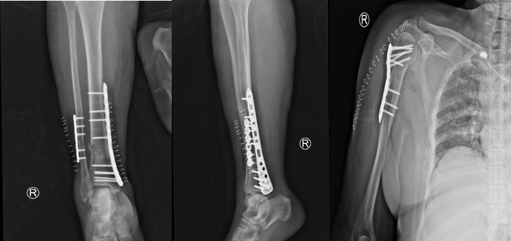 病情稍有稳定后,其它治疗迫在眉睫,如不能抓紧手术,严重的并发症将使患者再次陷入危险之中。骨科何罕亮副主任医师综合考虑患者情况,决定实施分期手术。第一次先行肱骨骨折切开复位内固定术 +胫腓骨骨折切开复位内固定术,第二次视患者情况择期行全髋关节置换术。第一次手术的关键在于速度要快!这一次手术一共需要处理两个部位、三处骨折,为了尽量减少对患者的影响,手术要求在短时间内完成。何罕亮医师团队术前仔细研究病情,术中精细操作,全部手术在3小时内顺利完成,手术中出血仅130ml,术后复查X线显示骨折对位对线良好。