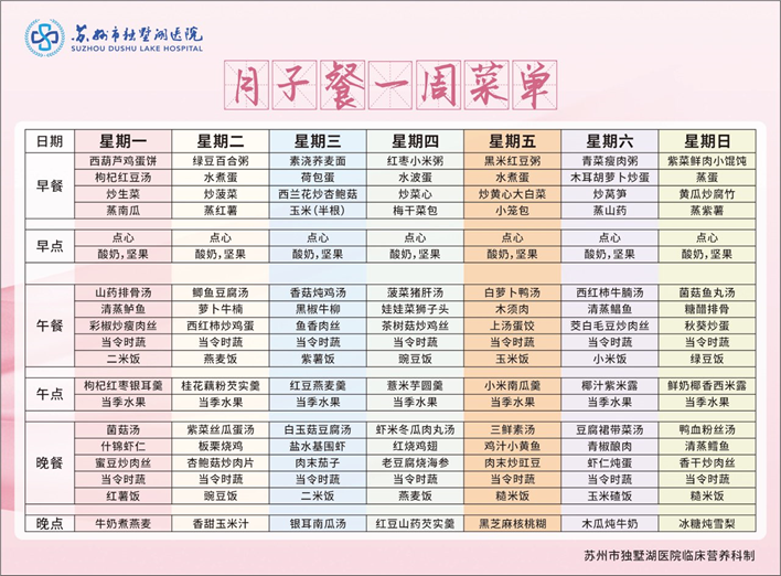 我院营养科专家团队结合《中国居民膳食指南(2016)》及《中国居民膳食指南(2022)》依据哺乳期妈妈的膳食原则与每一类食物的推荐摄入量,制定了我院的月子健康餐菜谱。