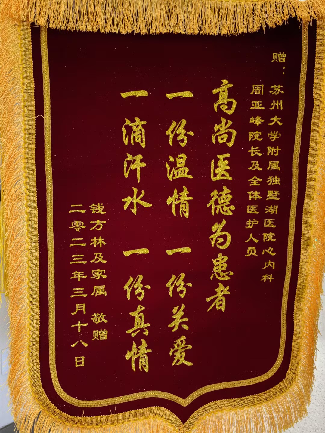 患者钱先生及家属赠送锦旗感谢我院心内科周亚峰副院长及全体医护