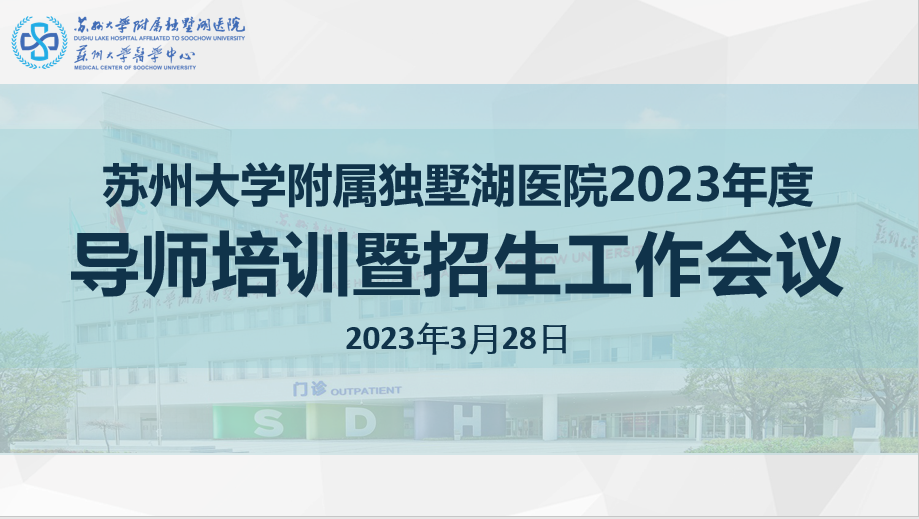 为深入学习贯彻党的二十大精神,落实习总书记对研究生教育工作的重要指示,加强我院研究生导师队伍建设,全面提升研究生导师指导能力,同时具体布置2023年研究生招生工作安排,科教处于3月28日下午举行了附属独墅湖医院2023年度研究生导师培训暨招生工作会议。会议邀请到苏州大学苏州医学院党工委副书记吴德建,会议由科教处处长江淼主持。