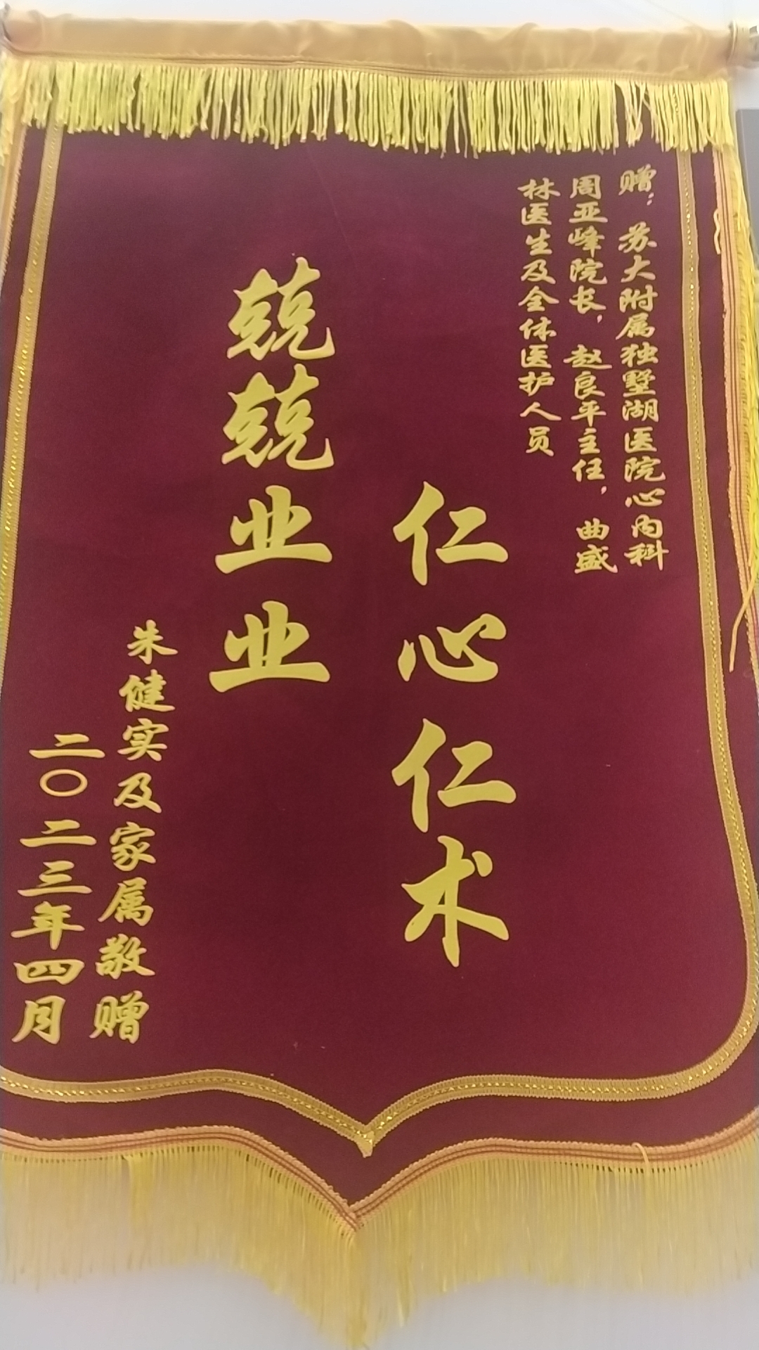 患者朱先生及家属赠送锦旗感谢我院心内科周亚峰副院长、赵良平副主任医师、曲盛林医生及全体医护