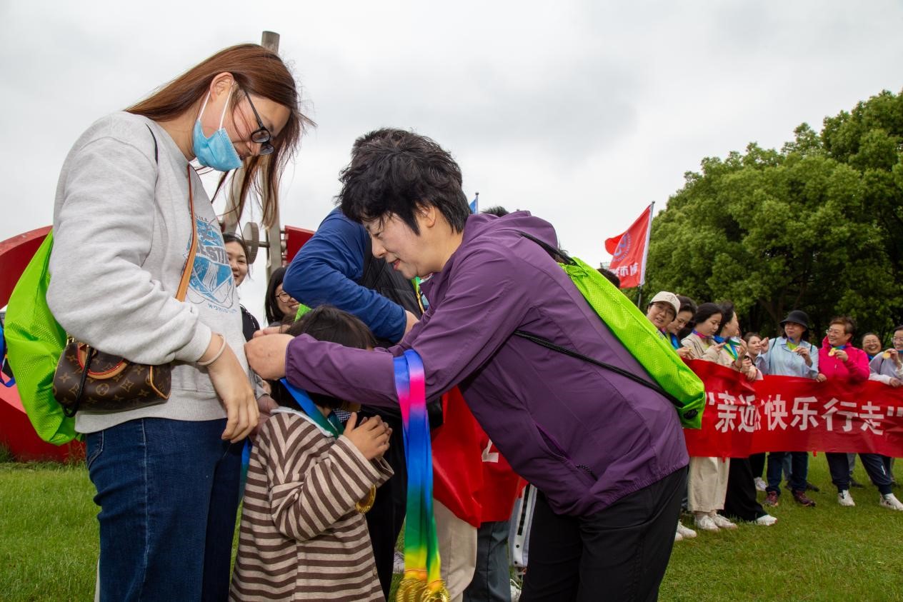经过一个多小时的徒步,大家相互鼓励、相互扶持,全体成员顺利抵达终点。在独墅湖图书馆旁的大草坪上,医院工会副主席王洁亲手为每一位职工颁发了活动纪念奖牌并在总结讲话中表示,此次徒步活动只是“走进园区”系列活动的开始,后续工会还将职工提供更多研究式、沉浸式、互动式的体验活动。