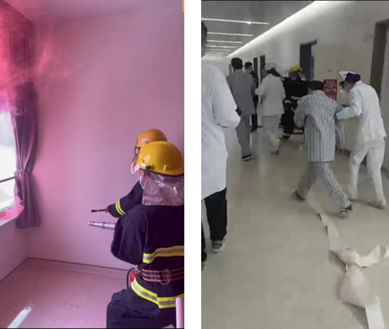 随后,按照演练方案,模拟火势无法控制的情况。医务人员接到总指挥指令后,迅速组织对病人进行疏散,按照既定路线和逃生预案疏散转运患者和家属。院内消防通讯组、疏散组、灭火组分工合作,微型消防站人员积极控制火势蔓延。消防救援中队接到报警后,迅速出动3台消防车赶赴现场处置,在各方人员的共同努力下,大火被成功扑灭,演练圆满结束。