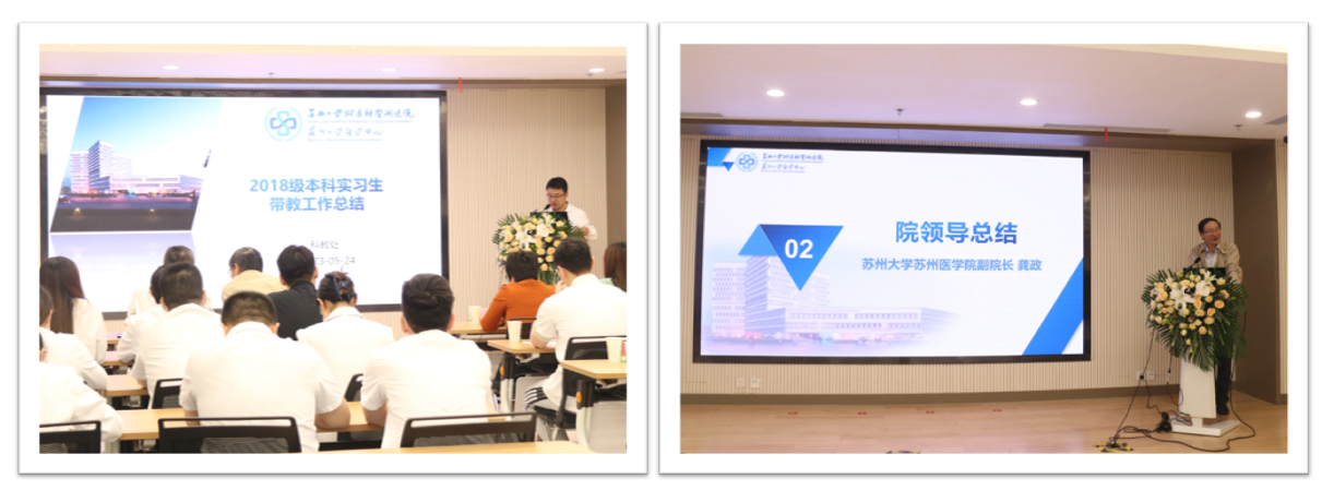 附属独墅湖医院周亚峰副院长在致辞中表示,在医学院和医院领导的支持下,医院顺利完成第一批实习生的带教考核工作,为后期培养更多的实习生提供了宝贵的经验。在这一年的实习生培养过程中,医院积极保障学生的学习和生活质量,不仅安排了定向专业辅导,还尽力为实习生同学提供优质的住宿环境,方便实习通勤。各位实习同学兼顾实习任务和考研升学准备,最终15名实习生中有9名进入国内高水平医学院继续深造,包括复旦中山医院、华山医院、上海交通大学、江苏省人民医院等,另有两位同学选择在独墅湖医院继续攻读硕士研究生。随后,江淼处长对实习工作进行了简单的总结汇报,分别从临床带教管理和导致“一对一”教学模式、以及日常教学督导和学生安全管理等方面介绍了一年以来的工作情况。