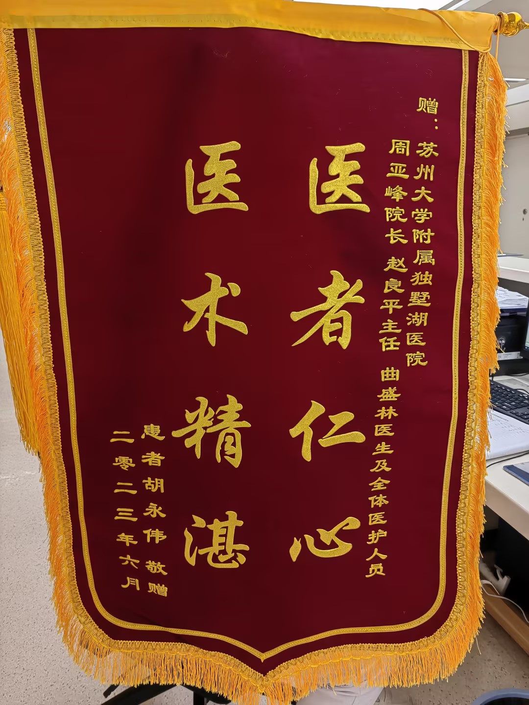 患者胡先生赠送锦旗感谢我院心内科周亚峰副院长、赵良平主任医师、曲盛林医生及全体医护