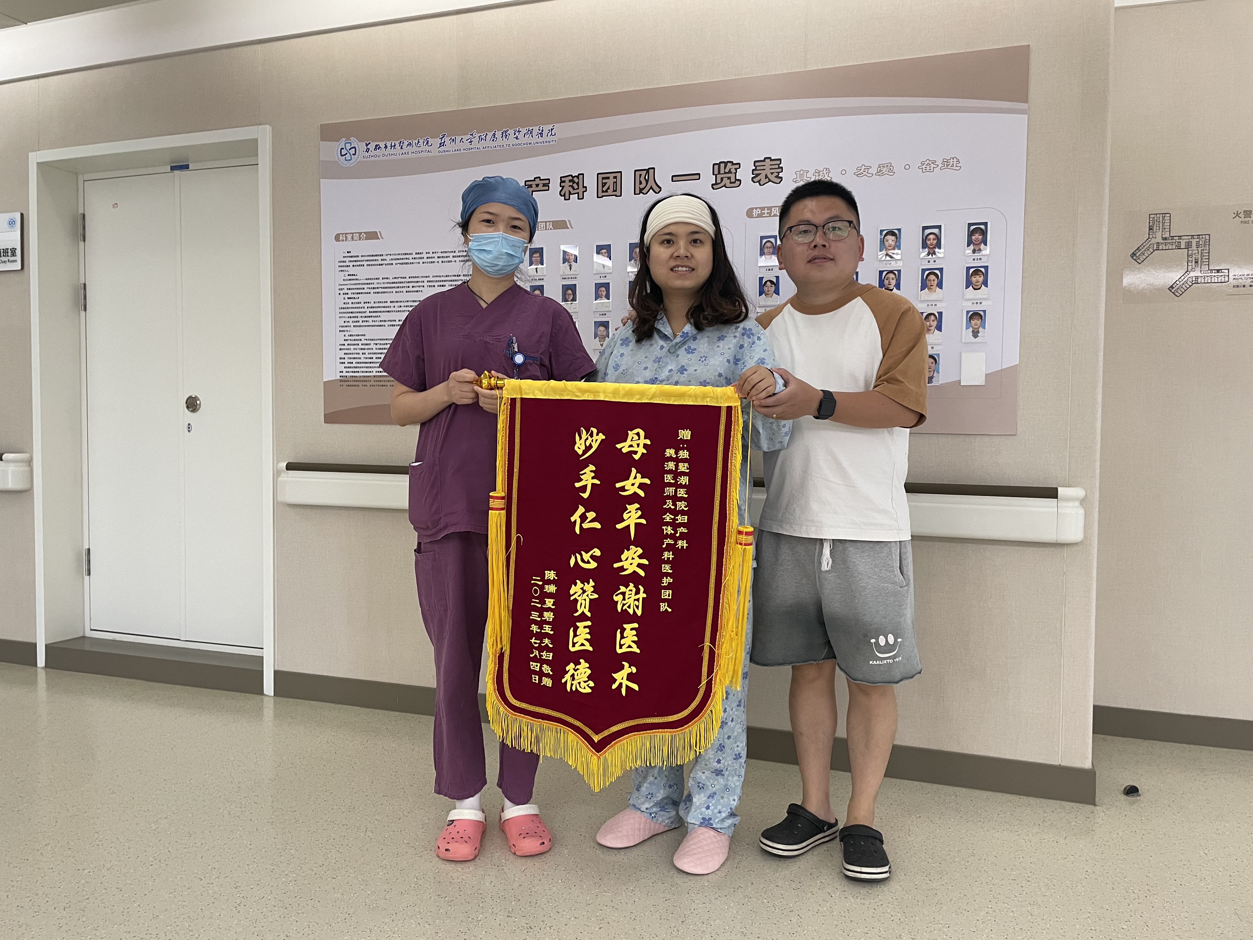 患者陈、夏夫妇赠送锦旗感谢我院妇产科魏满护士及全体医护