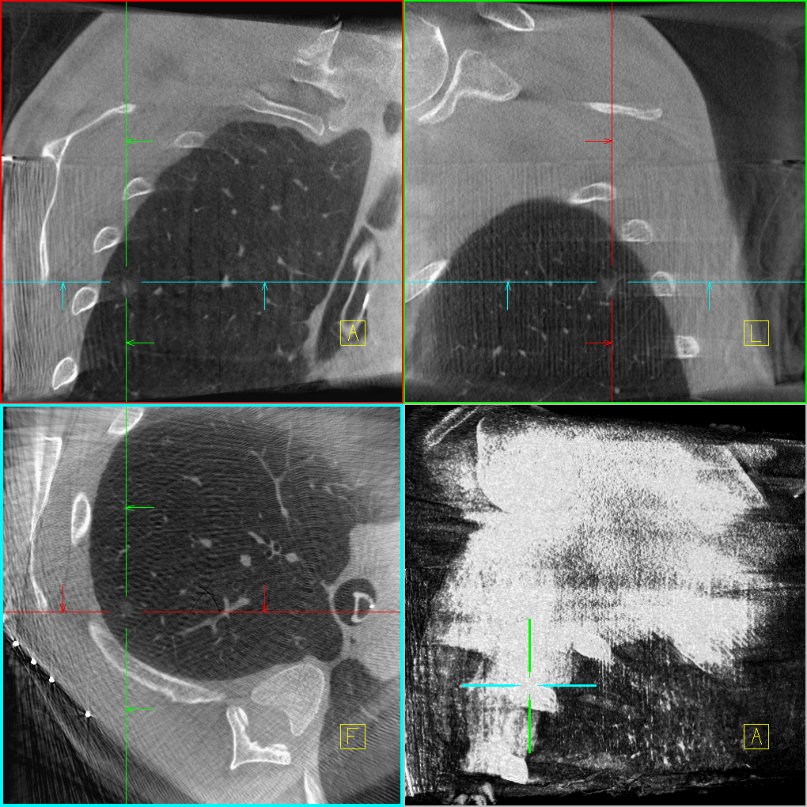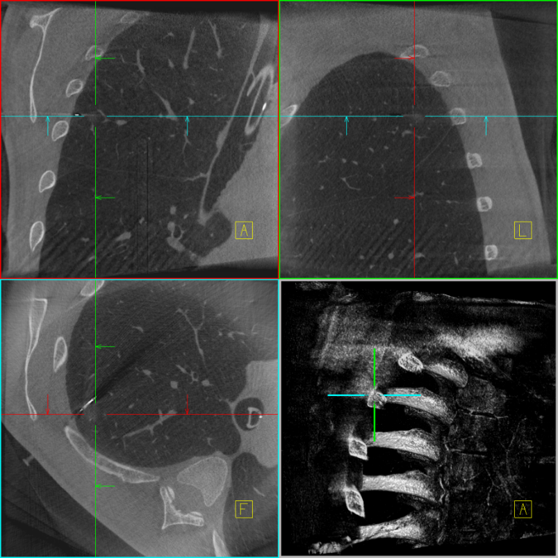 手术当天中午,患者进入手术室,进行常规气管插管全身麻醉。在进入麻醉状态后,患者取右侧卧位,在右上肺病灶的后背投影处粘贴CT快速引导垫。