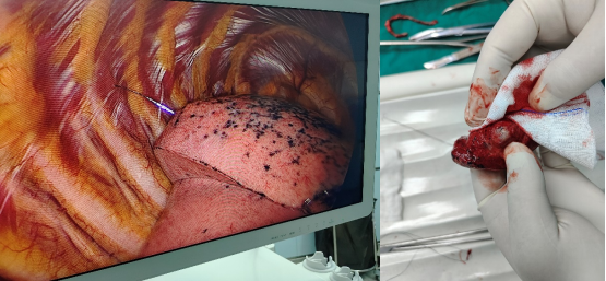 再次扫描,评估定位情况;摆放体位,消毒,开始手术;右上肺后段切除后,切开病灶,可见病灶与定位点毗邻,术中快速病理示右上肺结节为微浸润腺癌,手术顺利,患者安然返回病房。