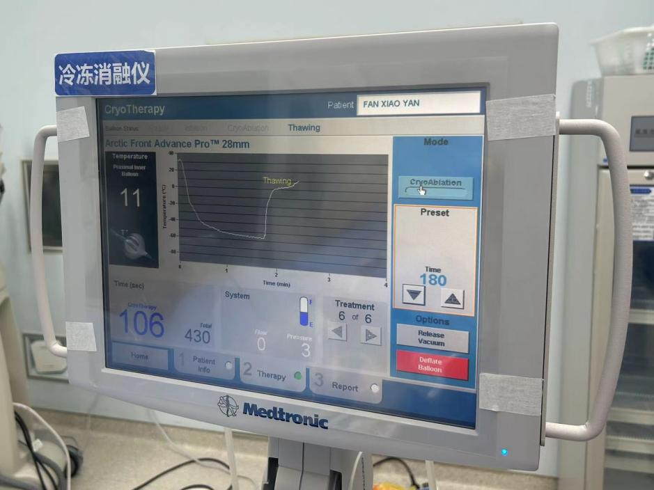 心血管内科副主任陈弹带领电生理团队对范阿姨的左心房三维重建图像进行仔细分析,并在多次病例讨论后认为范阿姨更适合采用安全性更高、更高效的“冷冻球囊消融”手段治疗。在医护人员的通力合作下,陈弹副主任带领团队为患者实施消融手术。术中,冷冻球囊完美贴合四个肺静脉开口并成功隔离肺静脉电位,手术取得圆满成功。