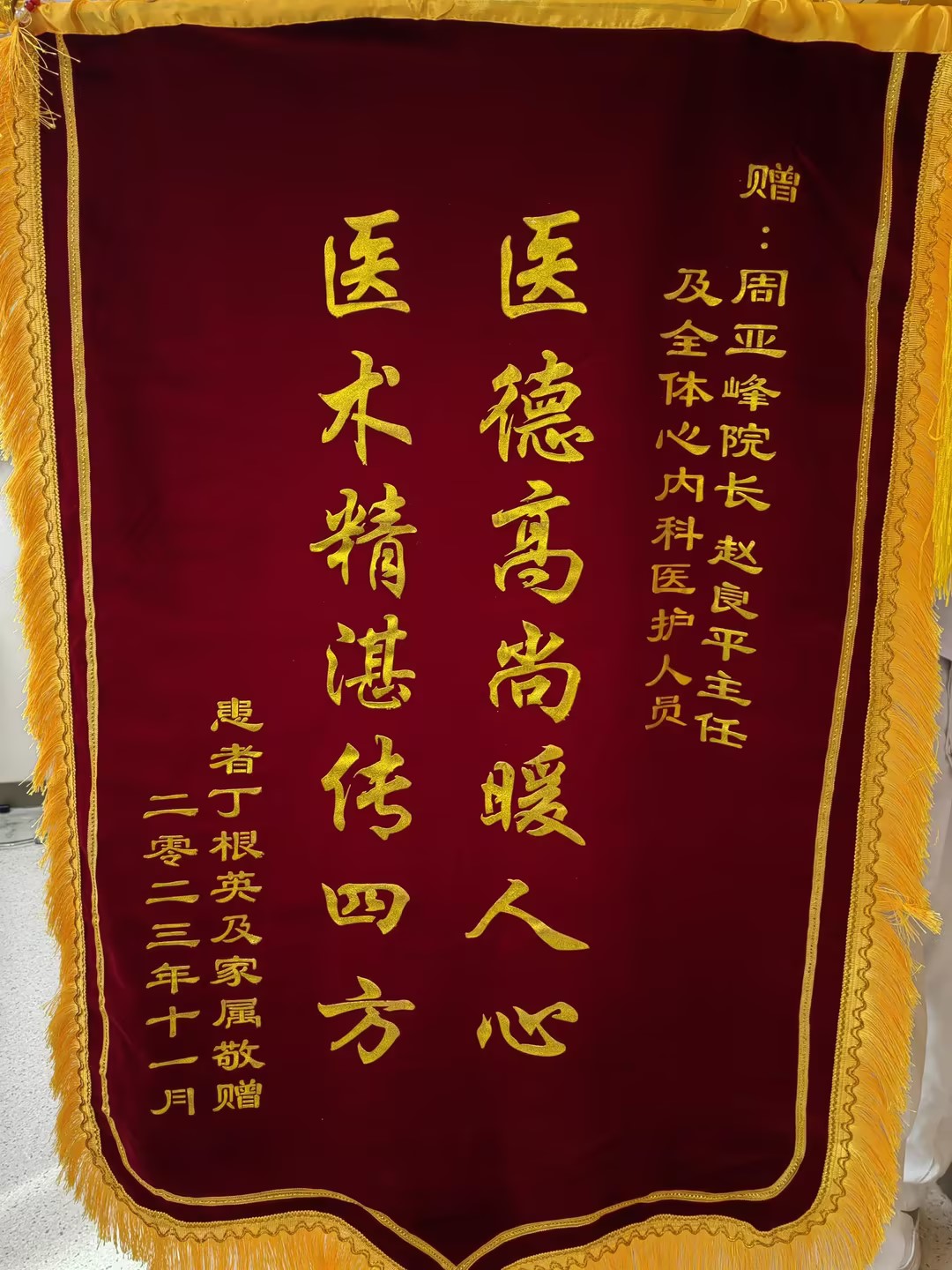 患者丁女士及家属赠送锦旗感谢我院心内科周亚峰副院长、赵良平副主任及全体医护