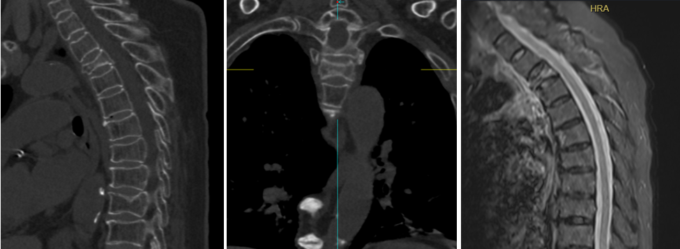 今年85岁的丁老太10天前在家里不小心摔了一跤,当即感到胸背疼痛不适,在家卧床休息数天仍不见好转。由于有过类似经历,丁老太之前摔跤后在当地医院做过椎体注射“骨水泥”的手术,且效果良好,于是家属想着大不了再打一次“骨水泥”就好了。随即到先前的医院检查,确诊是脊柱压缩性骨折,但与以往不同的是,这次是第三胸椎骨质疏松性压缩性骨折。第四胸椎以上由于位置特殊,手术操作难度大、风险高,通常是不做“骨水泥”手术的。当地医院的医生建议老太回家卧床休息保守治疗。随后患者和家属辗转就诊了几家医院,得到的建议都是保守治疗。难忍的疼痛及无法起床使老人陷入了绝望之中。