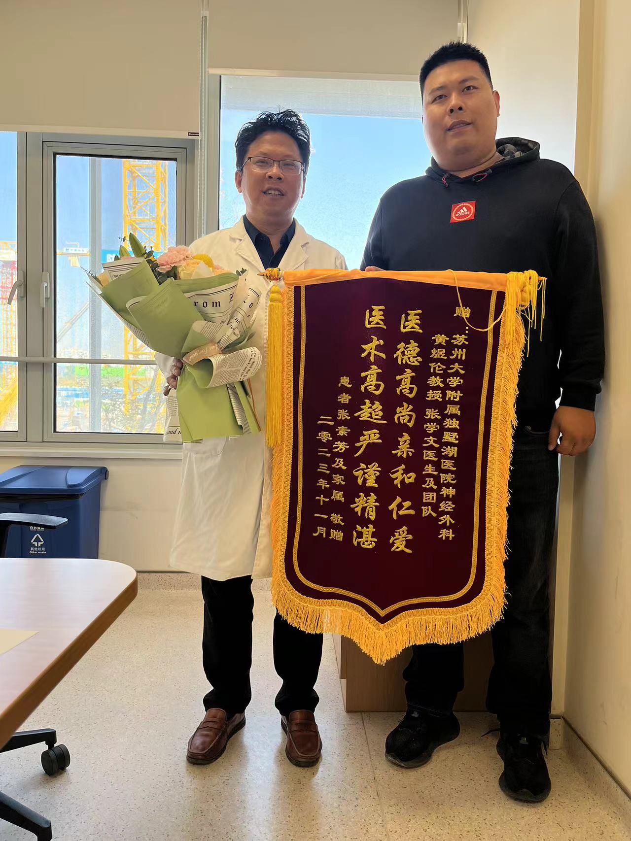 患者张女士及家属赠送锦旗感谢我院神经外科黄煜伦主任、张学文医生团队