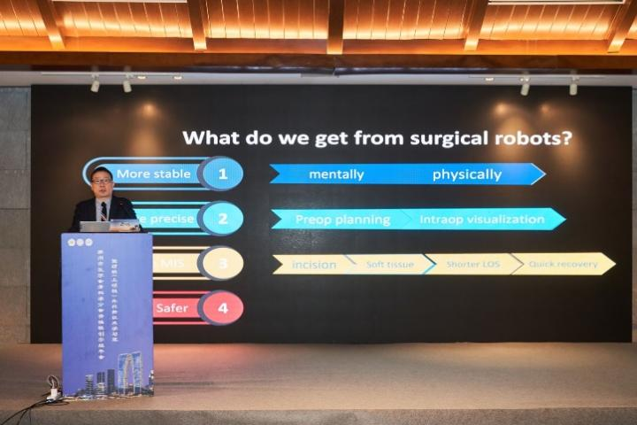 授课环节,上海交通大学医学院附属瑞金医院脊柱外科主任梁裕为大家授课。梁教授以“脊柱外科机器人的现状和前瞻”为主题,结合国内外进展,对骨科脊柱机器人的现状总结概括,并对未来机器人由“半自动”向“全自动”发展的前景进行了展望。