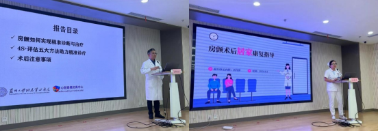 随后,心内科董瑞庆副主任医师以“听听心声,关注房颤”为题,向病友及家属们介绍了房颤患者的精准诊疗方案,病情风险的评估以及房颤患者手术后的相关注意事项等方面的内容科普。吾丹萍护士则向大家分享了房颤术后居家康复的相关注意事项。