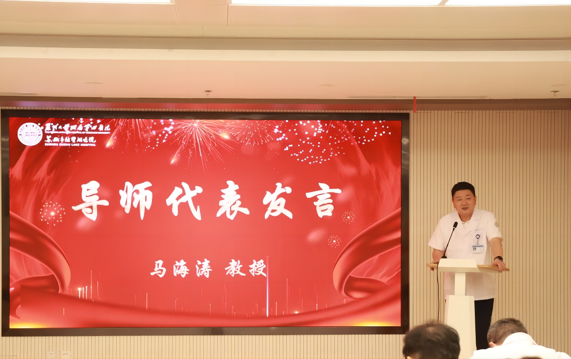导师代表马海涛教授上台发言,他对毕业生们表达了深深的祝福和期望,希望他们能够在未来的职业生涯中不断进步,成为医学领域的佼佼者。