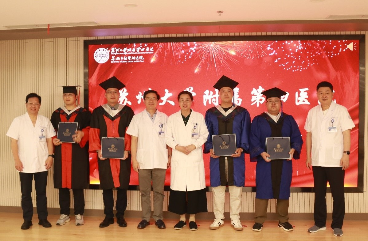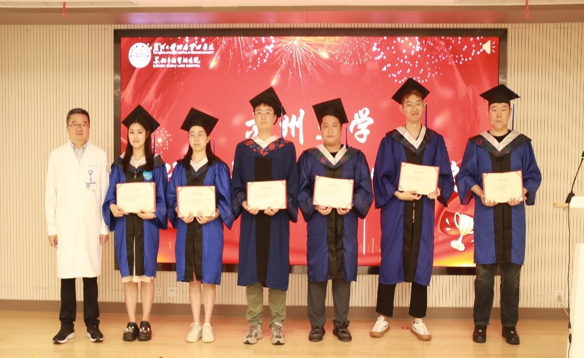 随后,周亚峰副院长为获得苏州大学优秀毕业研究生荣誉称号的学生颁奖。这是对他们在学术和医德方面优异表现的肯定,也是对他们未来职业生涯的鼓励。紧接着,学位评定委员会委员陶敏教授、姜为民教授、蒋军红教授、马海涛教授向毕业生代表发放了附四院精心准备的毕业纪念品,这些纪念品不仅是毕业生与附四院之间的情感纽带,更承载着对他们未来人生旅途的最诚挚的祝福。
