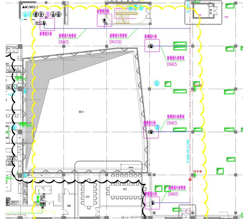 见上图,增加5套消火栓及配件(含管道及配件),并接入原有管道系统及火灾报警系统。