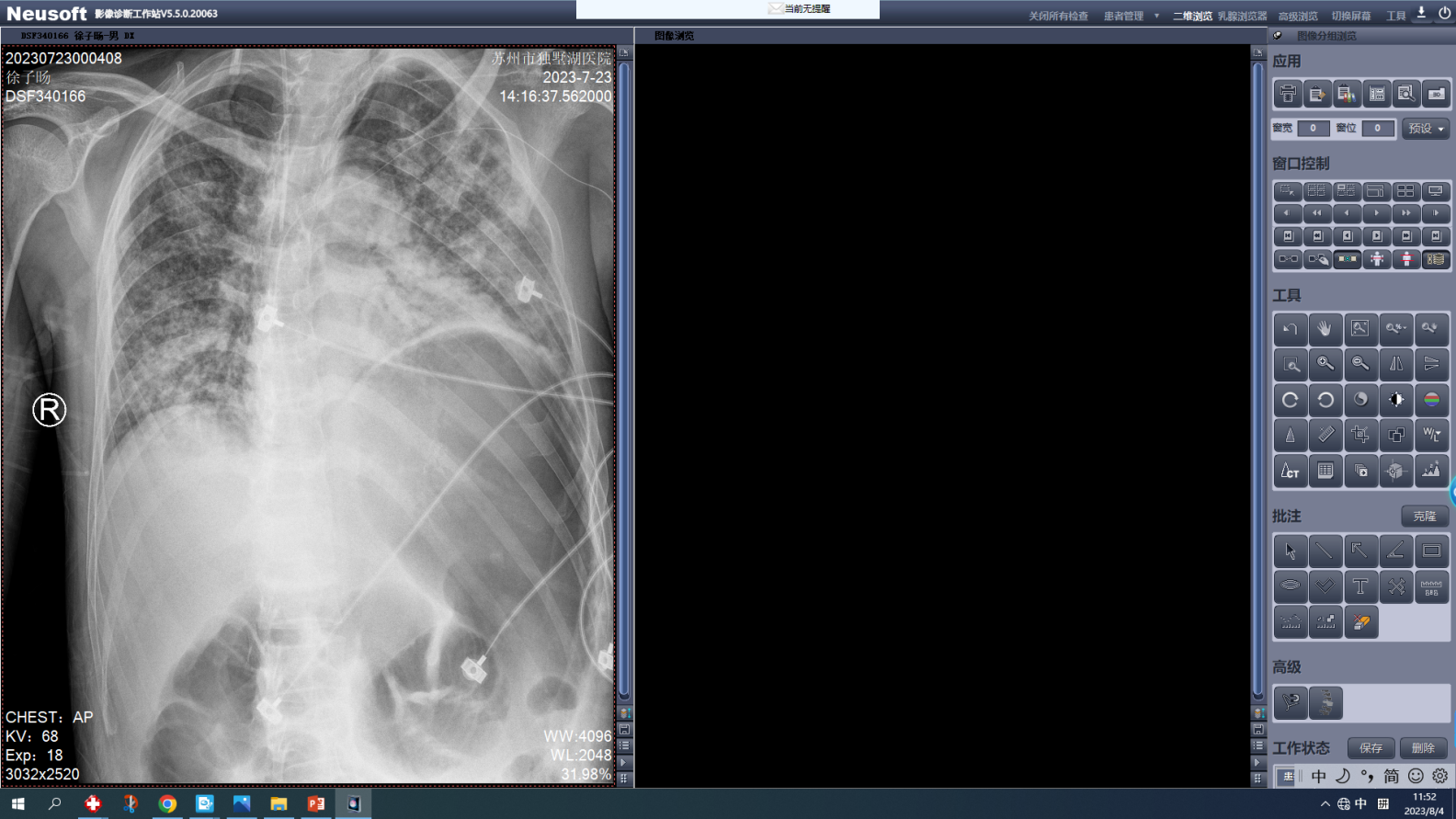 经过医疗组详细的探讨机文献查阅,决定给患者上机ECMO,速集结ECMO医疗团队,迅速完善与患者家属相关谈话及签字。在2023年7月23号18点30分给病人上机ECMO,50分钟后上机结束。ECMO团队本着对患者负责任的态度,行事认真负责、果敢,技术过硬。患者的指脉氧逐渐提升,给患者迎来了生的希望。