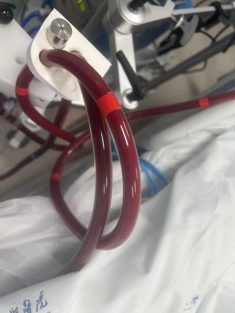 患者呼吸机参数及血管活性药物剂量上调,氧合、循环仍十分不稳定,命悬一线之际,急诊医学科迅速集结ECMO团队成员,向患者家属充分告知病情、预后及相关风险,家属表示充分信任并同意,医疗组迅速完成患者置管,护理组高效预充管路,医护配合高度默契,一切准备就绪,迅速打开阻断钳提高转速,患者静脉暗红色的血随着管路进入模肺,氧合后变成鲜红色又随着管路泵回患者体内,维持患者组织和器官氧合血供,患者的指脉氧迅速回升至100%,血流动力学也逐渐改善。