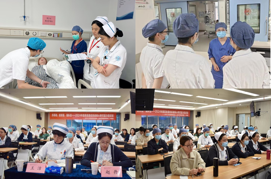 培训由理论培训、临床实践、个案汇报和OSCE考核4个部分组成,教学形式丰富,内容覆盖全面。理论培训阶段,邀请到我院危重症领域资深的医疗与护理专家分别从重症患者风险识别、院内安全转运、血糖管理和营养支持等方面详细讲解了该领域的急难问题和研究进展,夯实了学员们的理论基础。临床实践阶段,各危重症科室遵循同质化教学原则,结合专科疾病特点,让学员们在实战中掌握技能,在挑战中磨砺技艺。培训尾声,通过个案汇报和OSCE考核的形式,以练促学,巩固了学员们的培训成果。