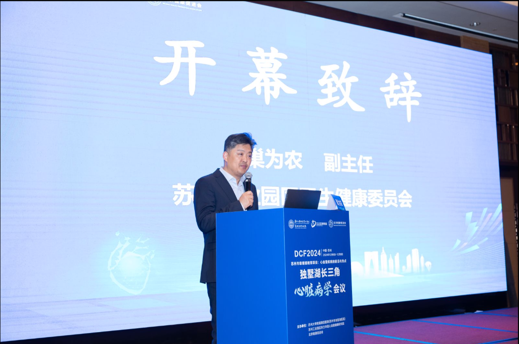 最后,苏州工业园区卫健委巢为农副主任发表致辞,巢主任介绍了苏州工业园区卫生健康事业的背景与发展,回顾园区在健康中国战略中积极作为所取得的卓越成绩。他表示,苏州大学附属第四医院作为园区唯一的现代化三级医院,在心血管疾病防治方面发挥着重要作用,推动了区域医疗资源的整合与协作,全面带动区域医疗服务水平整体提升。此次会议旨在促进心血管领域的科研与临床创新,进一步提升心血管疾病的防治水平,他期待能以此会议为契机,继续推动健康中国行动计划,助力患者拥有更健康的生活。