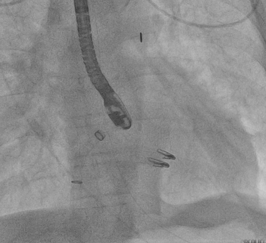 患者症状未有缓解迹象,仍然胸闷喘憋明显,血压和血氧饱和度进一步下降,周亚峰副院长、赵良平主任迅速评估,决定行急诊经皮二尖瓣钳夹术。该技术在心肌梗死后早期需要紧急干预的高危患者中,已经证明了其可行性和良好的疗效,然而风险极高。医生团队经与家属充分沟通取得信任,立即于全麻下行经皮二尖瓣钳夹术,术中经食道超声见该患者二尖瓣前叶整个A2 A3区完全脱垂,乳头肌收缩期甩入左房侧,二尖瓣极重度反流。术中为患者植入2枚二尖瓣夹(MitraClip),尽可能减轻了二尖瓣反流程度。术中即刻食道超声提示二尖瓣反流下降,肺静脉逆流消失,左房压LAP由术前43/15(24)mmHg降至23/14(17)mmHg。术后转入ICU进一步治疗,复查心脏彩超提示二尖瓣返流较前明显改善,继续主动脉内气囊反搏(IABP1:1反搏改善后负荷、呼吸机辅助通气。