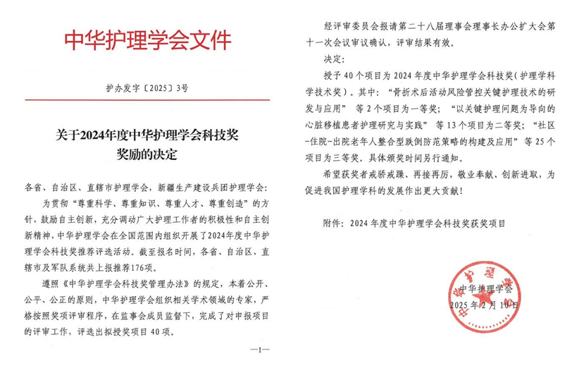 2025年2月10日,2024年度中华护理学会科技奖获奖名单正式揭晓,苏州大学附属第四医院护理部王洁主任申报的《智慧医疗背景下互联网+骨科康复延伸护理服务模式的构建与实证研究》喜获中华护理学会科技奖二等奖。