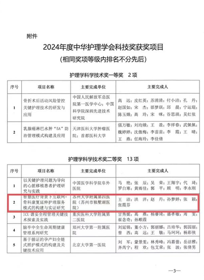 “中华护理学会科技奖”于2009年由中华人民共和国科技部批准设立,为中国护理学科最高奖项,每两年评审一次,授予在临床护理、护理教育、护理管理和社区护理等领域进行护理研究中做出突出贡献的护理科技工作者、单位和课题组,2024年度授奖共计40项。苏大附四院护理部王洁主任申报的《智慧医疗背景下互联网+骨科康复延伸护理服务模式的构建与实证研究》项目经苏州市、江苏省护理学会层层评审、限额推荐至中华护理学会,最终在全国上报的176项中脱颖而出,荣获中华护理学会科技奖二等奖。