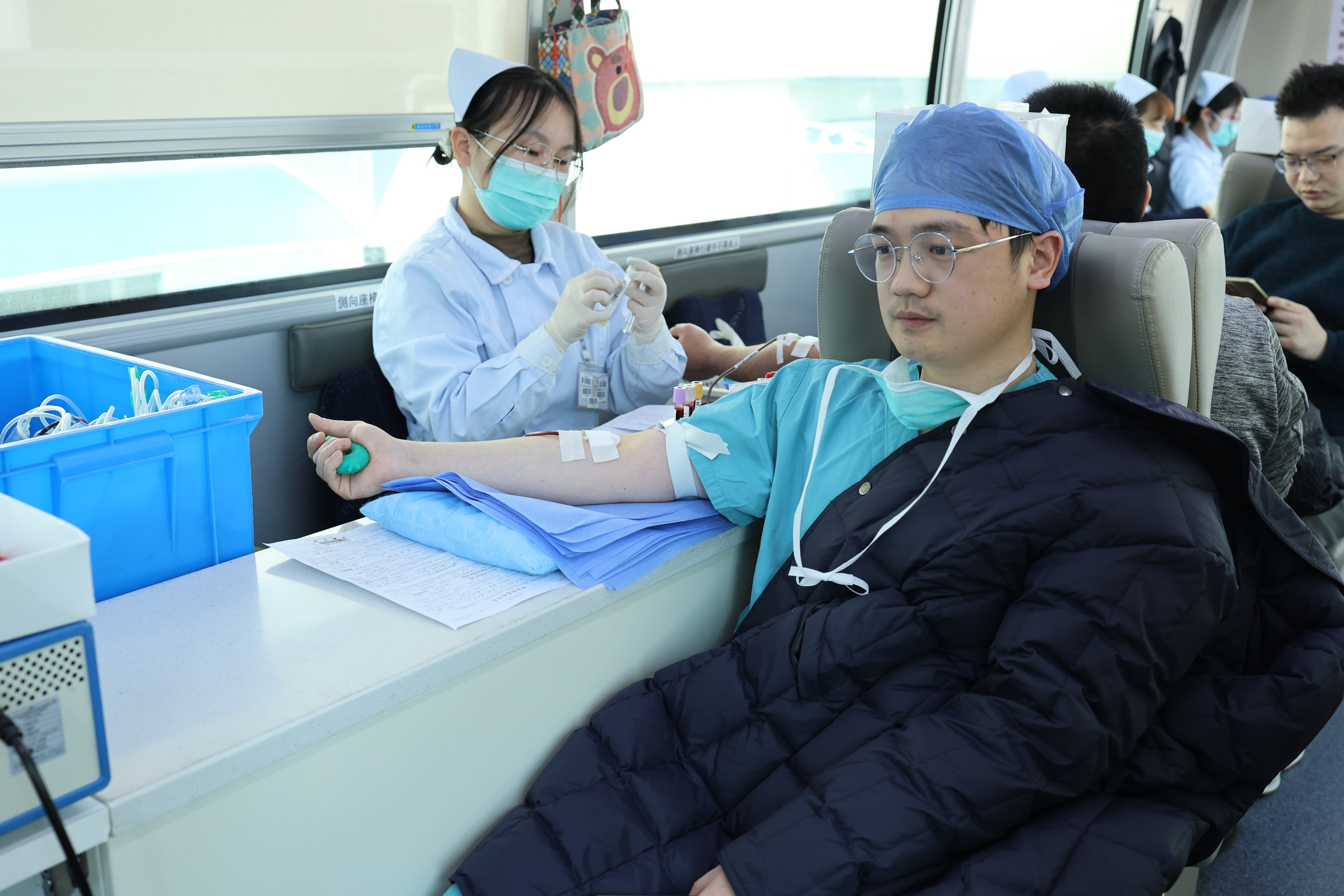 献血车内,医护人员和志愿者们配合紧密,为献血者提供温馨周全的服务,确保每一位献血者都能在安全、舒适的环境中完成献血。同时,他们耐心地解答着献血者的疑问并反复强调献血后的注意事项。