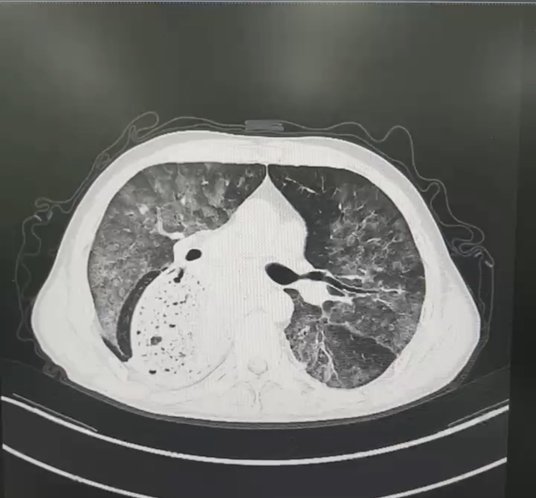 患者赵先生,反复的胸闷、呼吸困难一年有余,每一次呼吸都成为一种负担。随着时间推移,病情逐渐恶化,平静休息时难以缓解,活动后症状加剧。赵先生曾辗转多家医院就诊,然而疾病始终诊断不明,治疗效果不佳,病情时有反复,令患者和家属备受煎熬。近期,患者的病情急转直下,胸闷气急加重,甚至出现呼吸衰竭。门诊胸部CT提示两肺弥漫性渗出病变,紧急收入我院。
