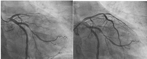 周亚峰副院长带领的胸痛中心团队在10分钟内就完成术前准备并初步诊断患者是典型的前降支闭塞表现,必须立即开通血管。冠脉造影证实了猜想的最糟糕情况:左前降支中段完全闭塞,右冠脉多处重度狭窄。在主动脉球囊反搏支持下,介入团队精准操作,成功开通闭塞血管,植入药物涂层支架,为患者赢得一线生机。