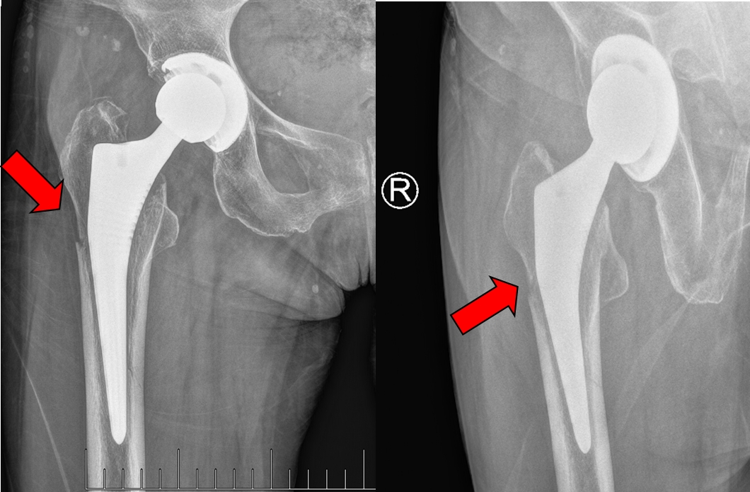 王女士二次受伤后影像检查提示假体周围骨折