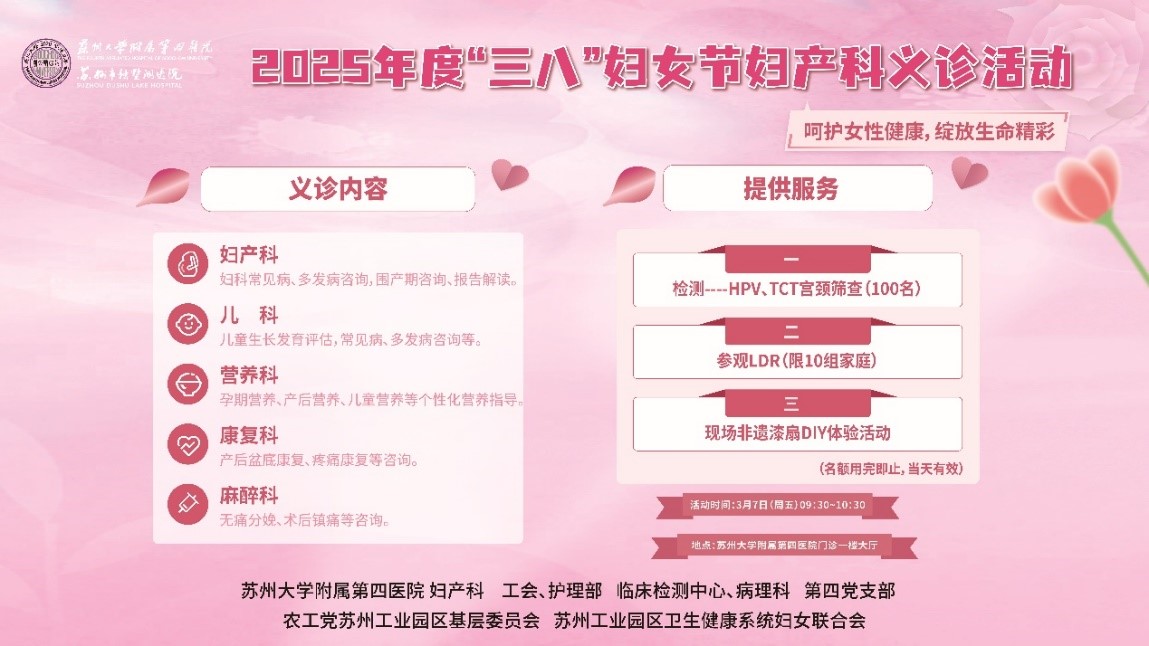 在苏大附四院工会及第四党支部的支持下,“呵护女性健康,绽放生命精彩”主题三八妇女节义诊活动3月7日于医院门诊大厅顺利举办。本次活动由妇产科牵头,联合儿科、麻醉科、营养科、康复科等多科室共同参与,旨在为广大女性朋友提供全方位的健康服务,传递苏大附四院对市民健康的深切关怀。