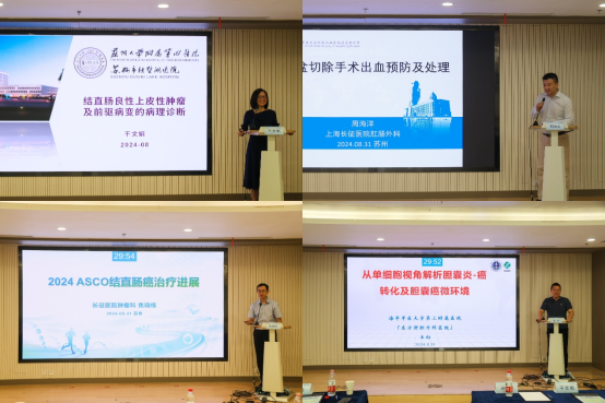 会议围绕三项主题开展,围绕结直肠肿瘤,苏大附四院病理科干文娟主任讲授结直肠良性上皮性肿瘤的特点及前驱病变病理诊断的要点;海军军医大学附属长征医院肛肠科周海洋副主任讲授全盆手术出血的预防及处理方式;海军军医大学附属长征医院肿瘤科焦晓栋副主任讲授直肠癌的化疗和免疫新进展。