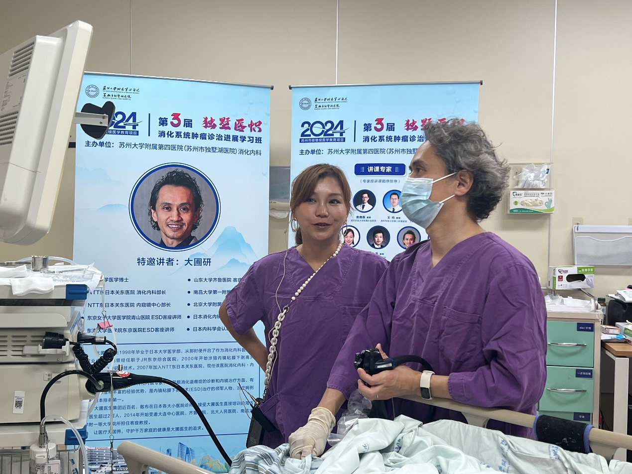 内镜主题环节,苏州大学附属第一医院消化内科李锐主任讲授消化道间质瘤在内镜诊疗中的困难及对策;苏州大学附属第四医院陈雨琪博士报告了单细胞测序分析技术在探索胃黏膜“炎-癌”转化机制中的研究进展;北京大学肿瘤医院吴齐主任详细介绍了中日内视镜技术。本次学习班特邀的日本著名内镜专家大圃研教授讲授了消化道早癌ESD技术。
