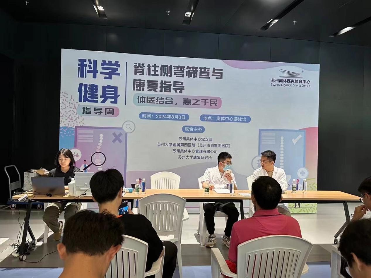 全民健身日当天,苏州大学附属第四医院运动促进健康中心联合苏州奥体中心,以“体医结合,惠之于民”为主题,在苏州奥体中心游泳馆开展了苏州市科学健身指导周之脊柱侧弯筛查与康复指导。为近百名青少年进行脊柱侧弯及足底功能筛查,根据筛查报告对青少年及其家属进行科学的姿势管理及运动指导。为附近居民、运动爱好者等提供免费运动预防及姿态评估、发放健康资料和运动处方,提升健康服务效率,最终促进园区全民健康水平提升。