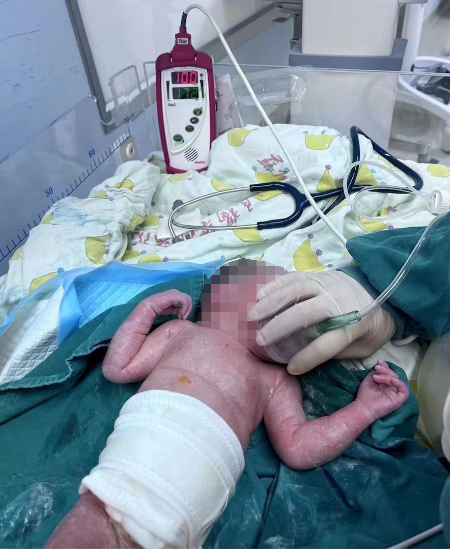 妇产科联合麻醉手术科即刻启动了紧急剖宫产,7时3分,手术刀片划下,7时6分便传来一声啼哭。手术室内所有的医护人员悬着的心终于放下:母体腹腔活动性出血得以控制、早产女婴健康,重2370g。母体腹腔内出血2000ml,子宫角既往宫角妊娠处见一破裂口活动性出血明显。子宫修补、输血、ICU维稳生命体征,通过1小时奋战,母婴救治成功。